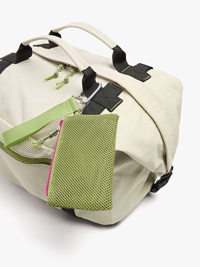 Sırt çantası olarak da kullanılabilen teknik kumaş spor çanta. Dikdörtgen şekilli. Astarlı ve cepli iç kısım. Fermuarlı kapama. Dış kısımda file cep. Karabina ile donatılmış file askı. Sırt çantası olarak kullanım için yastıklı ve ayarlanabilir omuz askıları. Sabit el tutacakları. Ayarlanabilir ve çıkarılabilir çapraz askı, çok yönlülük ve rahatlık sağlar.