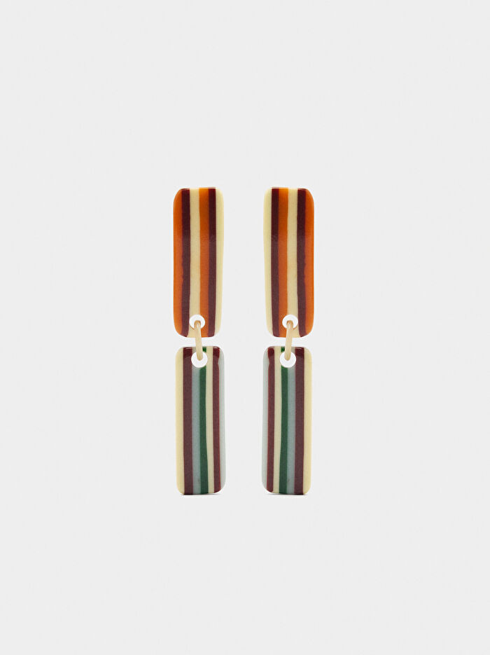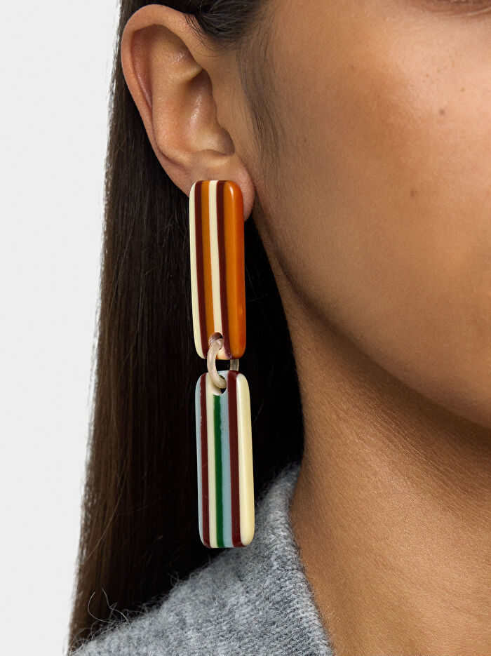 Çizgili çubuk formunda uzun küpe. Kontrast renkler. Parlak bitiş.