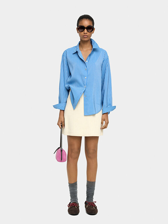 Yakalı, uzun kollu çizgili gömlek. Manşetlerde düğme detayı. Model 1,76 m boyunda ve S beden giyiyor.