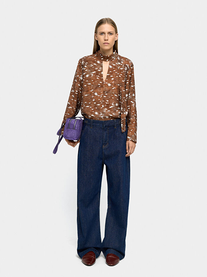 Uzun kollu desenli bluz. Boyun bağlı yüksek yaka. Önü ve arkası V yaka. Arkası düğmeli. Uzun kollu. Alt kısmı asimetrik. Model 1,75 m boyunda olup S beden giymektedir.