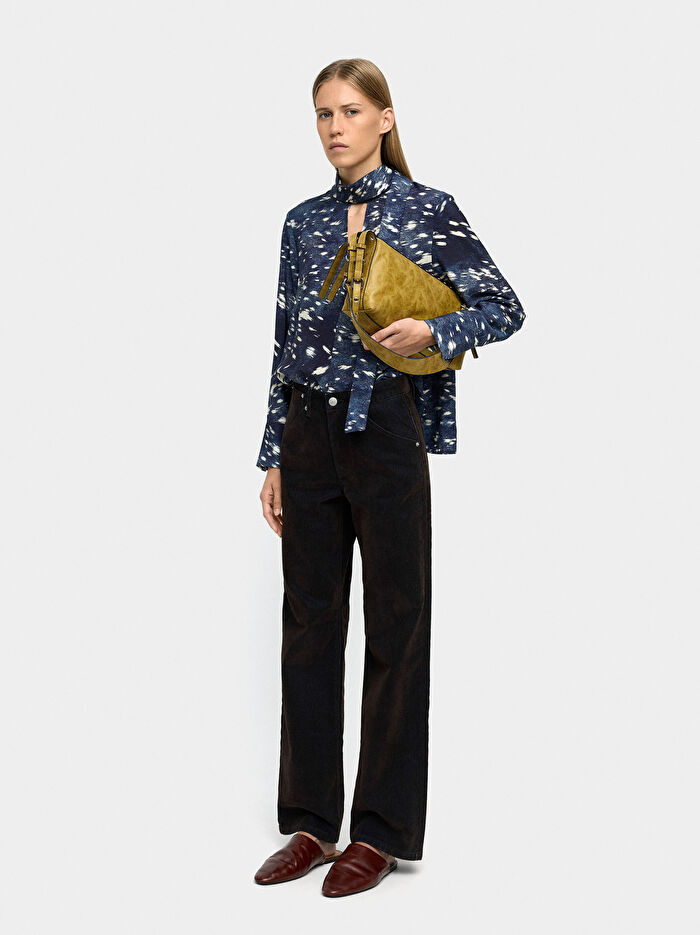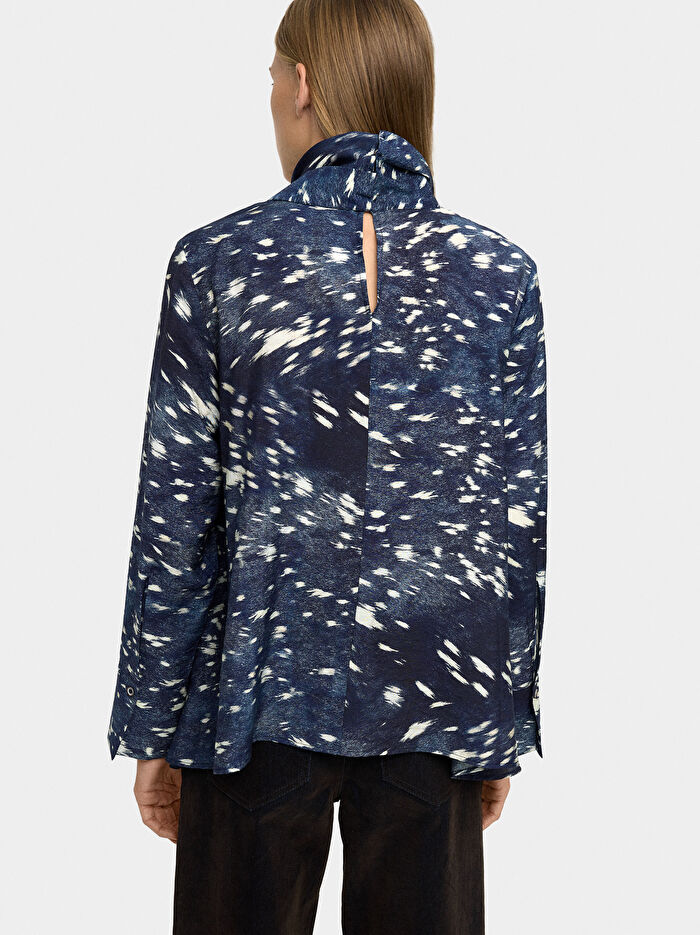 Uzun kollu desenli bluz. Boyun bağlı yüksek yaka. Önü ve arkası V yaka. Arkası düğmeli. Uzun kollu. Alt kısmı asimetrik. Model 1,75 m boyunda olup S beden giymektedir.