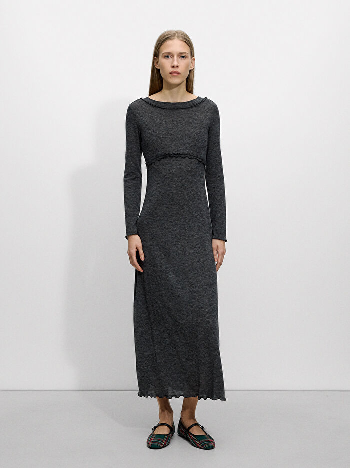 Uzun kollu midi elbise. Kayık yaka. Belirgin dikişler. Model 1,75 m boyunda ve XS-S beden giyiyor.
