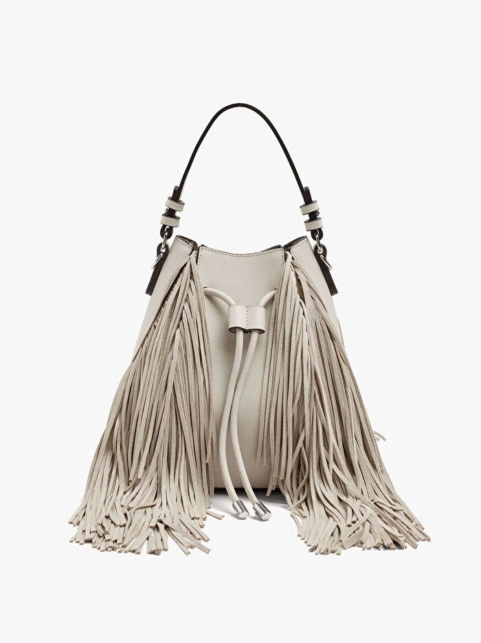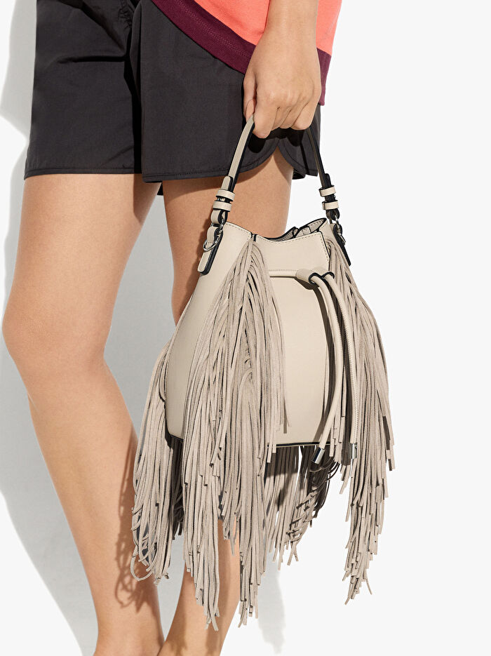 Ön ve arka kısımda uzun püsküllere sahip orta boy bucket çanta. Toplamak için ipli kapatma. Çıkarılabilir bileklik askısı. Ayarlanabilir ve çıkarılabilir çapraz askılı çanta askısı içerir.