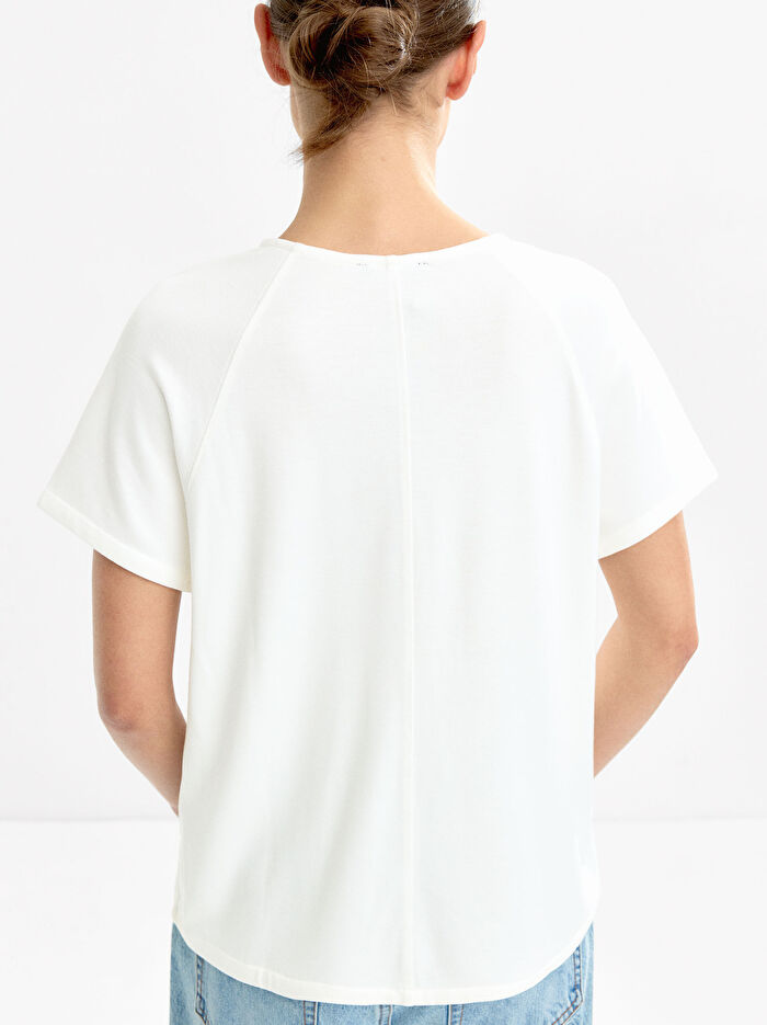Basic V yakalı tişört. Ortada görünür dikiş detayı. Kısa kollu. Model 1,76 m boyunda ve XS-S beden giyiyor.