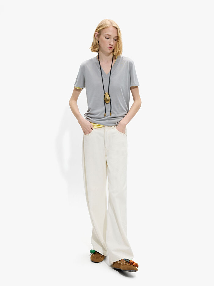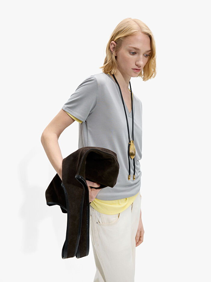 V yakalı basic t-shirt. Kısa kollu. Model 1,78 m boyunda ve S beden giyiyor.