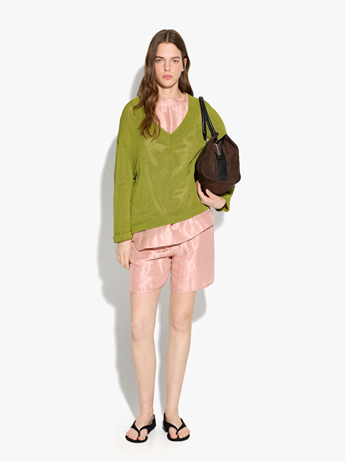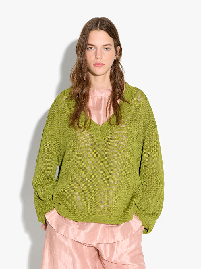 İnce ve düz örgülü kazak. Pamuk karışımı kumaştan üretilmiştir. V yakalı. Uzun kollu. Model 1,75 m boyunda ve XS-S beden giymektedir.