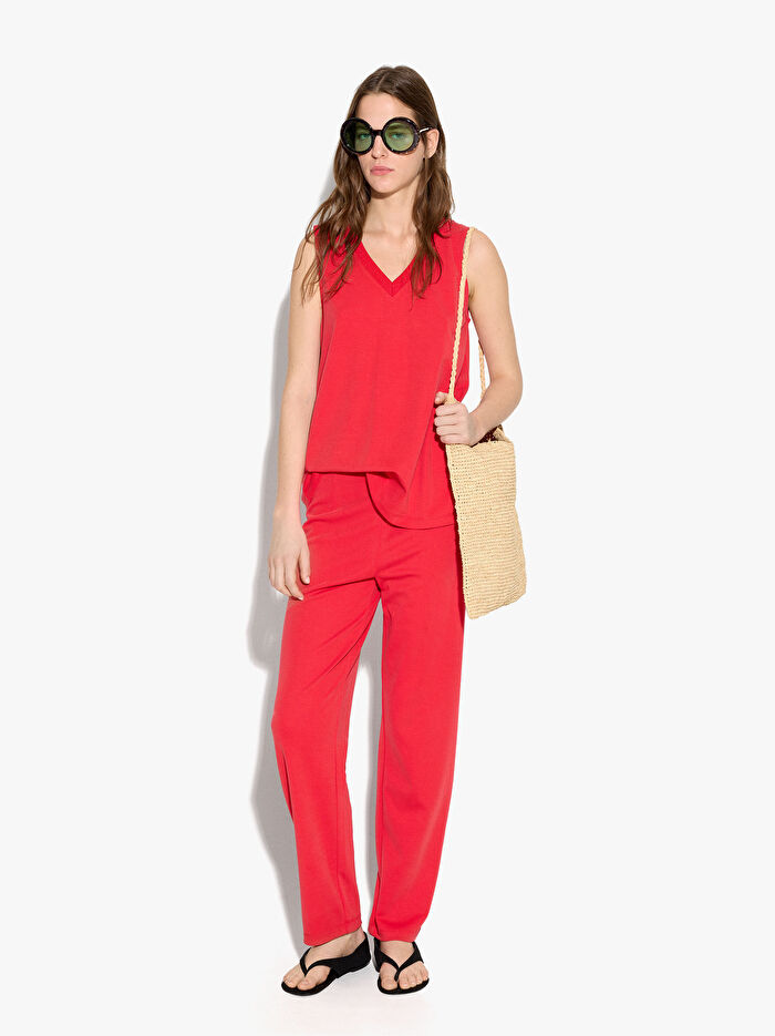 Bol kesimli ve sade üst. V yakalı. Kolsuz. Arka kısmında pileli detay. Model 1,75 m boyunda ve XS-S beden giyiyor.