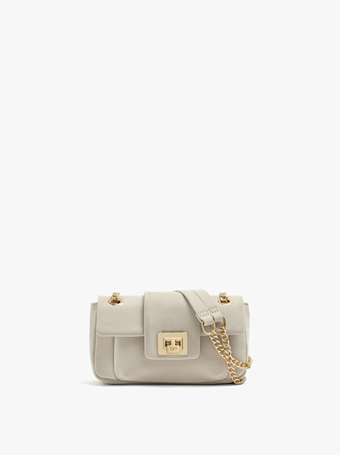 Yumuşak dokulu, küçük ve yastıklı omuz çantası. Dikdörtgen şekil. Astar ve iç cep. Düğmeli kapaklı kapatma. Sabit zincir askı.