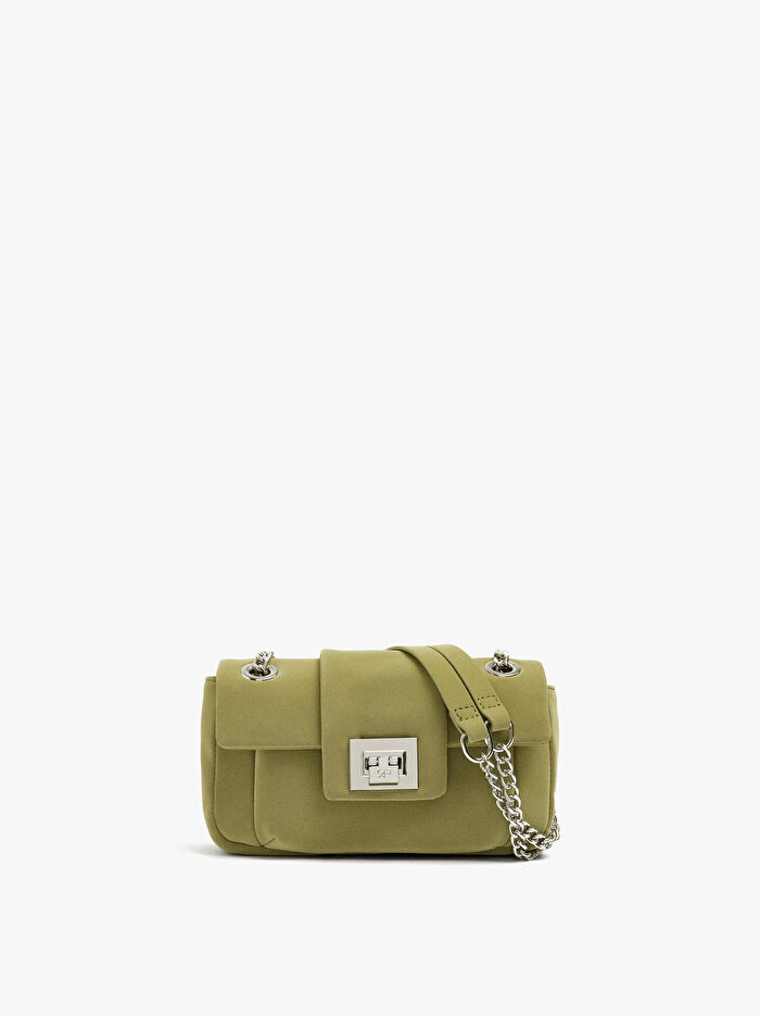 Yumuşak dokulu, küçük ve yastıklı omuz çantası. Dikdörtgen şekil. Astar ve iç cep. Düğmeli kapaklı kapatma. Sabit zincir askı.