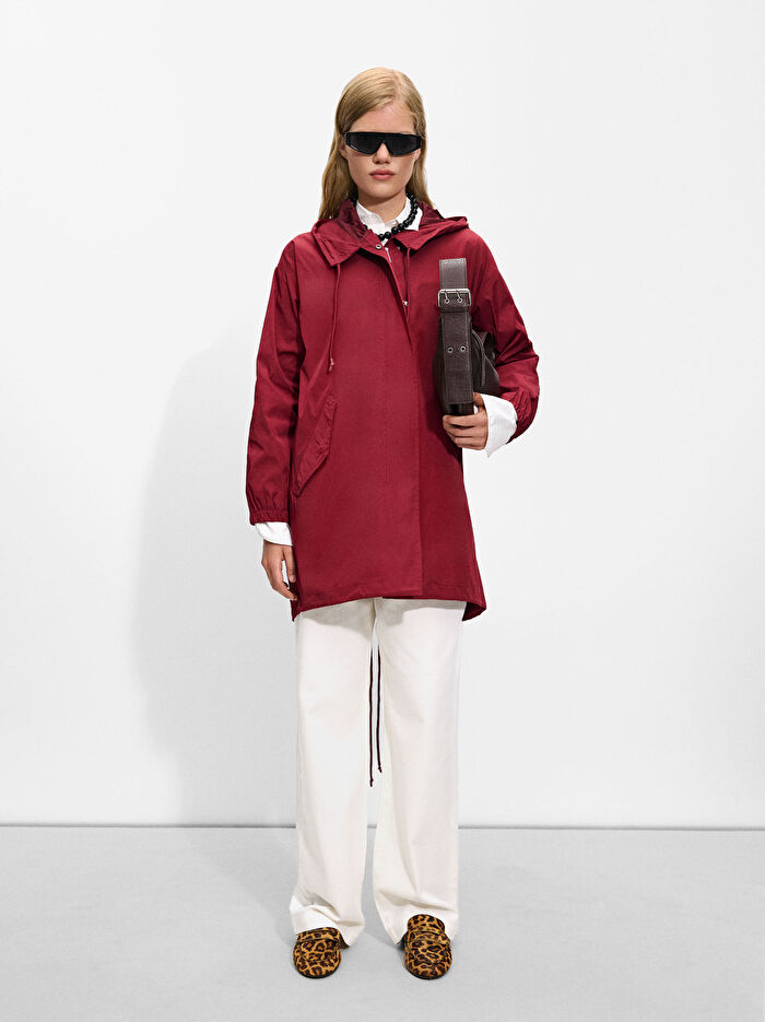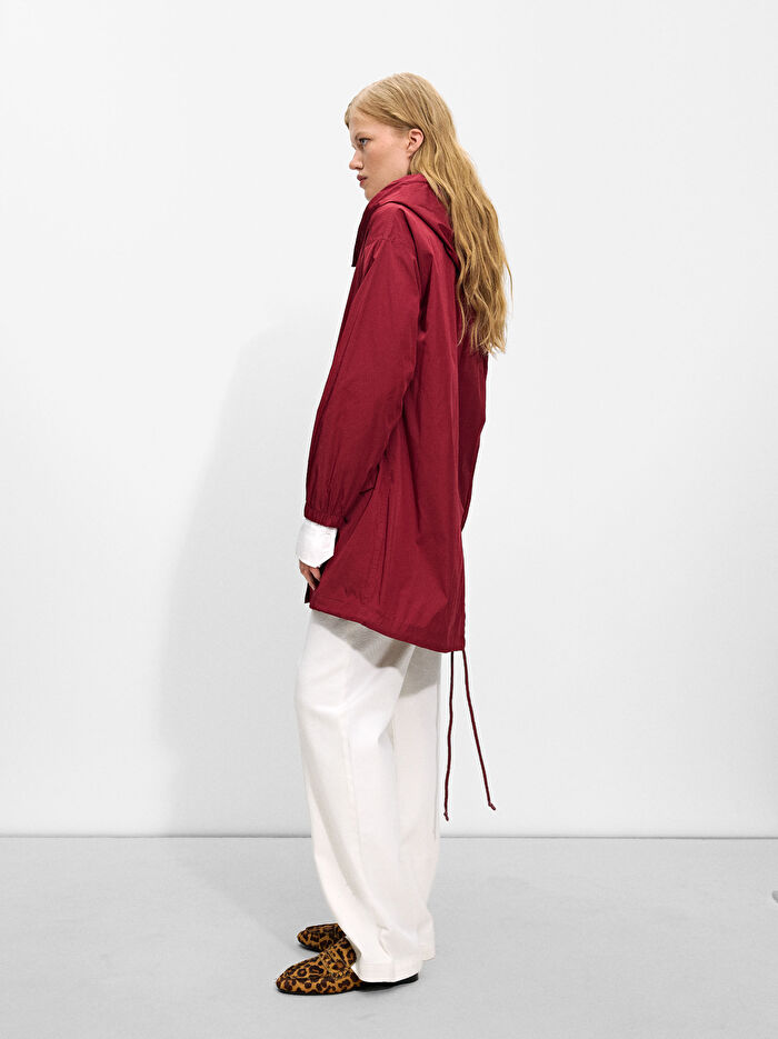 Yüksek yakalı ve kapüşonlu hafif parka. Uzun kollu, elastik manşetli. Önü fermuarlı ve düğmeleri gizli. Model 1,78 m boyundadır ve XS-S beden giymektedir.