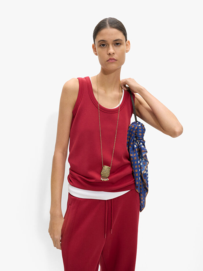 Yumuşak dokulu basic üst. Yuvarlak yaka. Kolsuz. Model 1,79 m boyunda ve XS-S beden giyiyor.