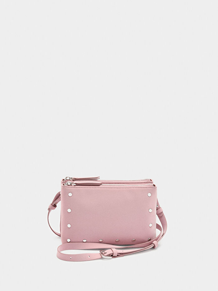 Yumuşak dokulu çift çapraz askılı çanta. Küçük boyutlu. Astar ve iç cep. Zımba detay. Çift fermuarlı kapama. Ayarlanabilir ve çıkarılabilir askı.