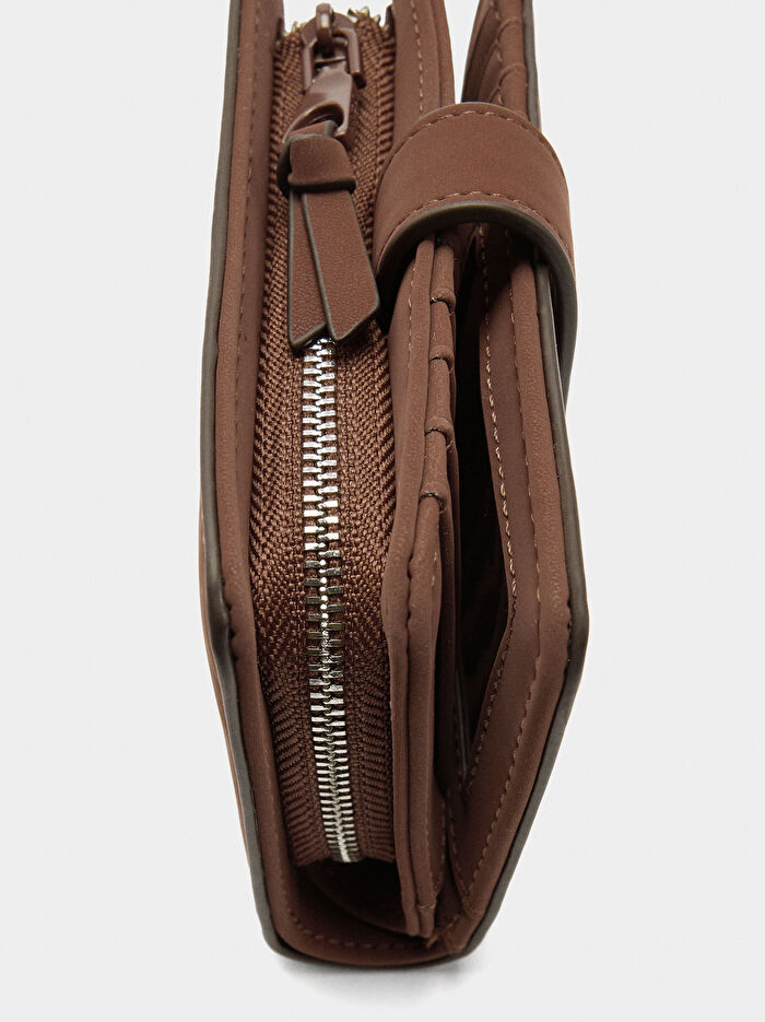 Yumuşak dokulu sade cüzdan. Orta boy. Kart yuvaları ve kağıt para bölmesi; kayışlı ve çıtçıtlı düğme kapamalı. Fermuarlı bozuk para bölmesi.