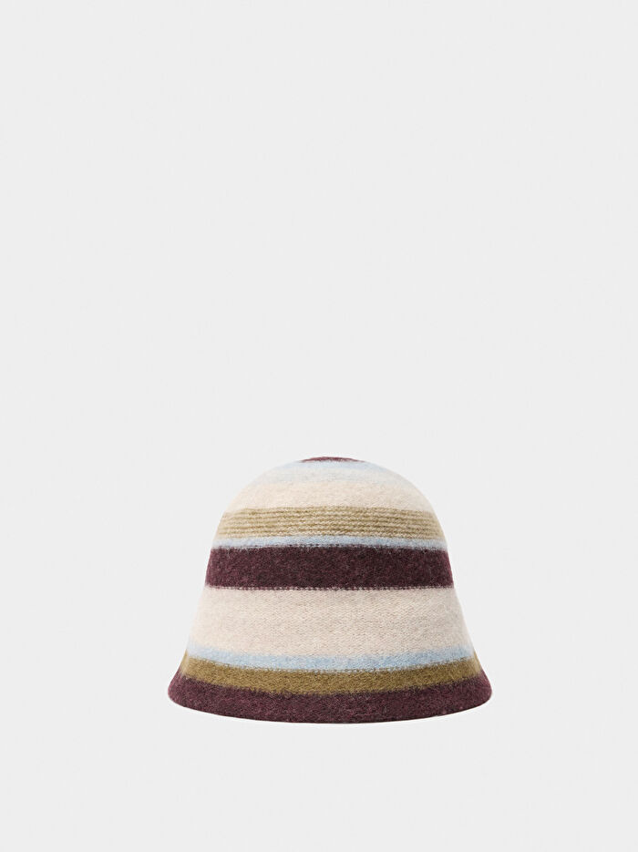 Yün bucket şapka. Çok renkli çizgili tasarım. Kış için ideal bir aksesuar, her tarza stil ve sofistike bir dokunuş katar.