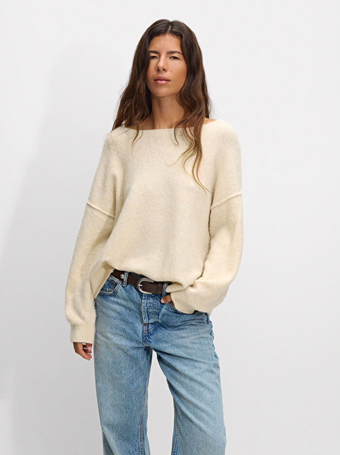 Yünlü örme kazak. Uzun kollu. Tekne yaka. Model 1.73 m boyundadır ve XS-S beden giymektedir.