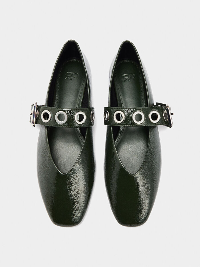 Ayakkabının ön kısmında kayış ve delikli zımbalar bulunan, ayarlanabilir tokalı babet. Çatlak efekti. Oval burunlu. Belirgin dikişli yastıklı iç taban. Termoplastik poliüretan taban.