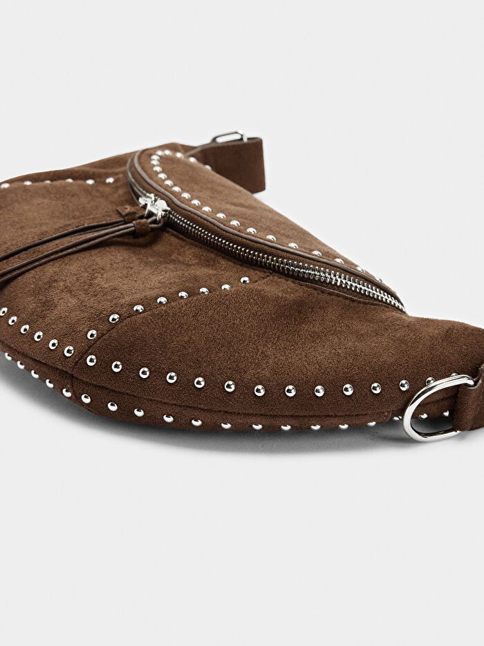 Deri efektli ve zımba detaylı küçük çapraz askılı çanta. Hobo tarzı. İç astar. Fermuarlı kapaklı kapatma. Sabit ve ayarlanabilir askı.