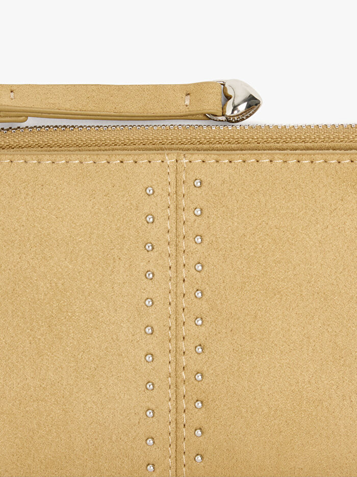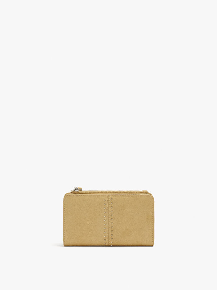 zımba detaylı ve deri görünümlü orta boy cüzdan. Kart yuvaları ve kağıt para bölmesi. Fermuarlı bozuk para bölmesi, fermuar çekme yerinde kalp detayı. Çıtçıtlı kapama.