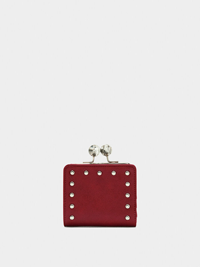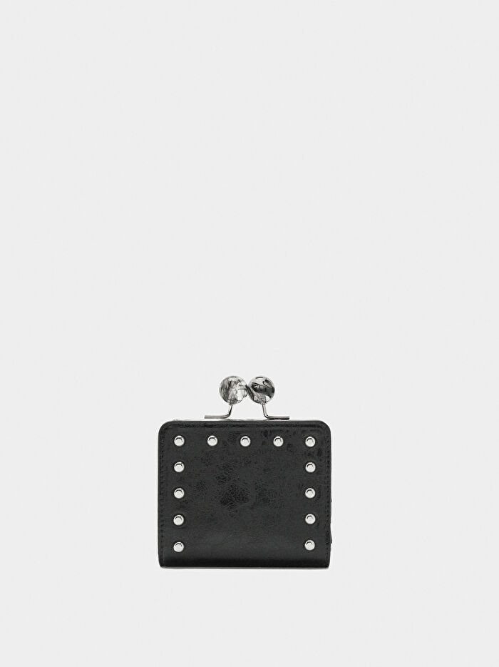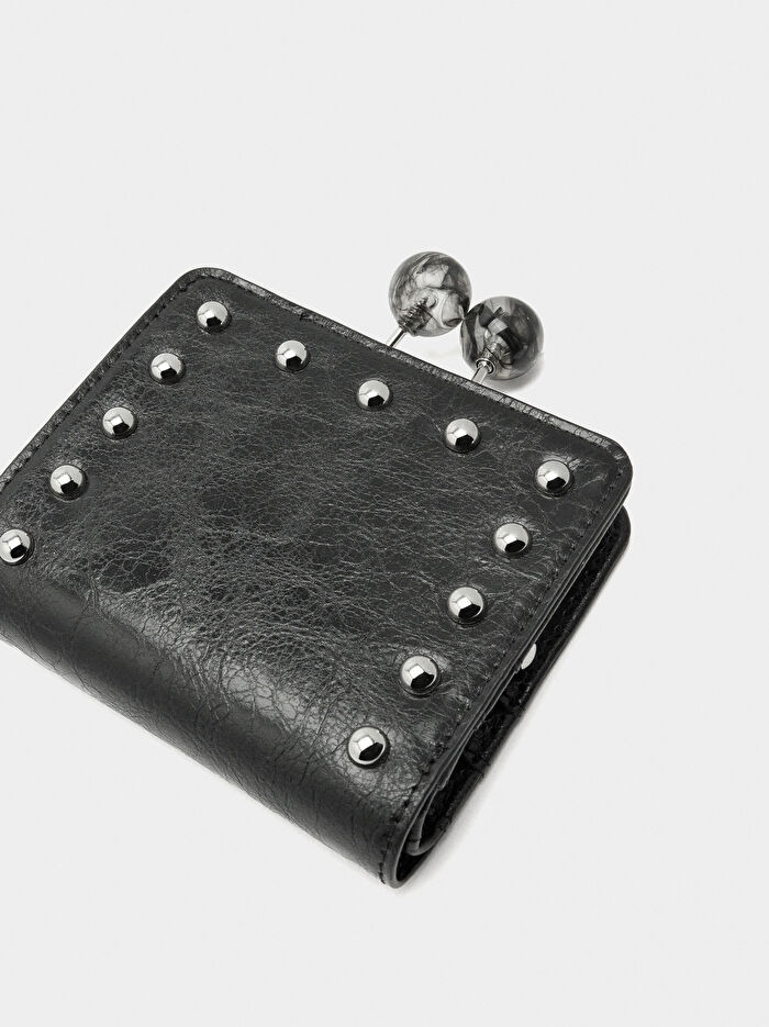 Çivili ve çatlak efektli küçük cüzdan. Kart yuvaları ve fatura bölmesi. Kiss-lock kapamalı ve küre detaylı bölme. Düğme kapamalı ana kapak.