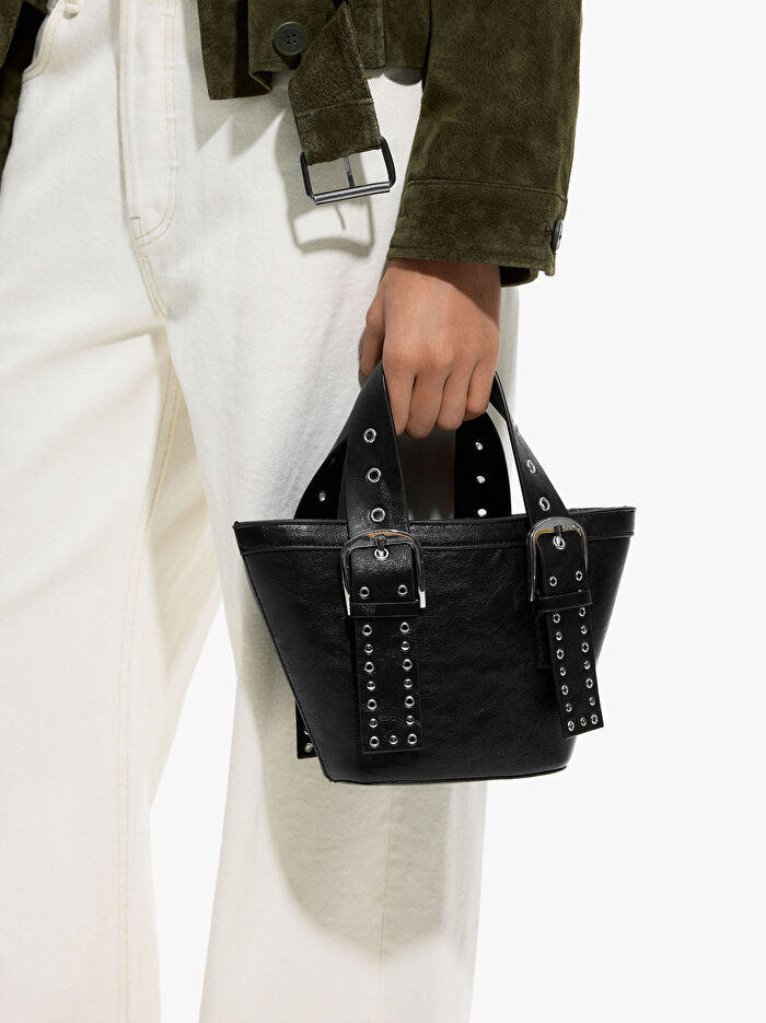 Zımba detaylı ve tokalı süslenmiş, küçük ve yapılı bucket çanta. İç astarlı. Ayarlanabilir el askıları. Ayarlanabilir ve çıkarılabilir çapraz askı da dahildir.