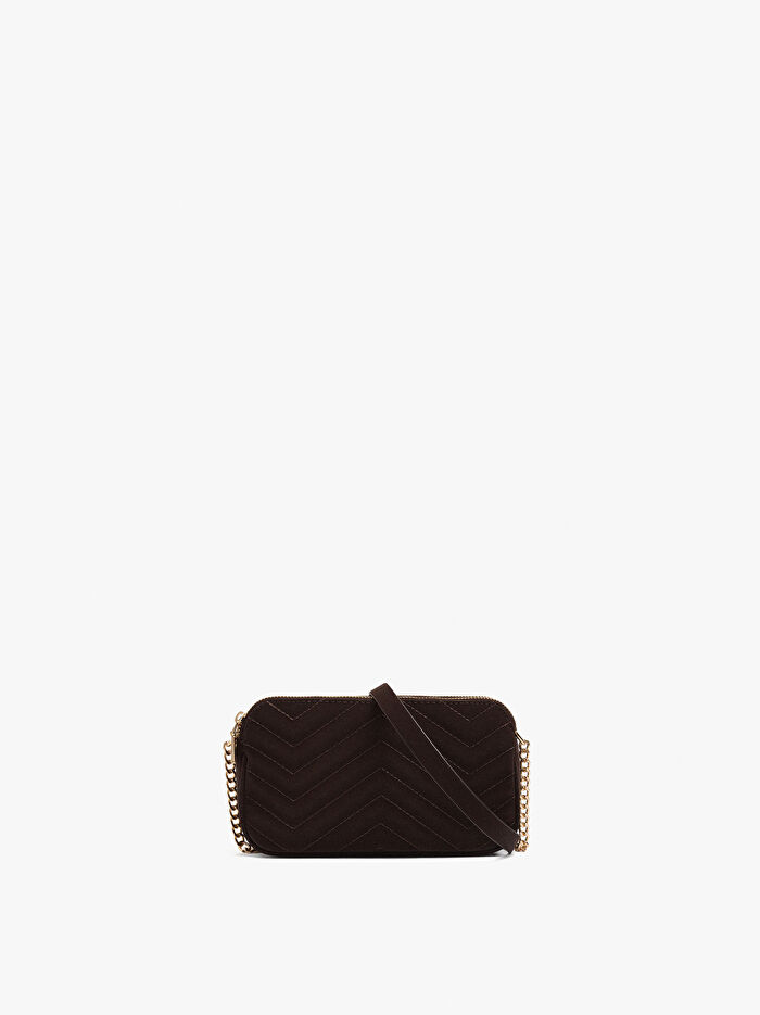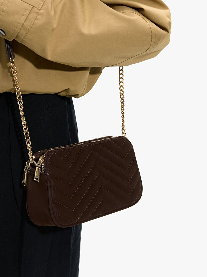 Fermuarlı kapatmalı iki bölmeli ve iç cepli kapitone çanta. Manyetik kapatmalı ana bölüm. Sabit, ayarlanabilir zincir askı.